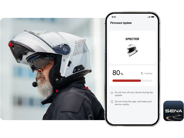 Mettez à jour votre SPECTER avec la dernière version du firmware grâce à la fonctionnalité Over-the-Air (OTA) via l'application Sena Motorcycles. Profitez des dernières fonctionnalités et améliorations de performance, sans aucun câble !
